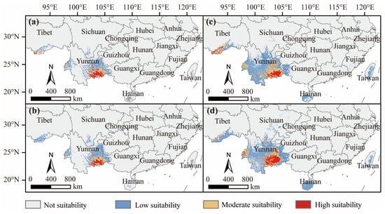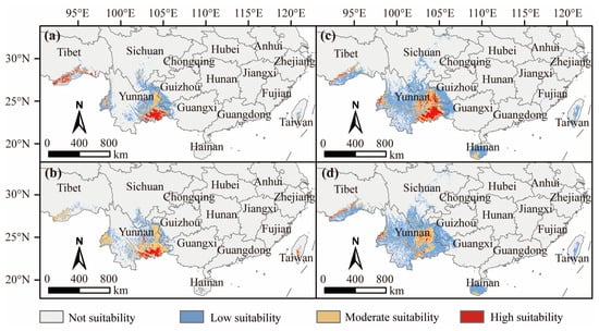 The species distribution models of D. dyeriana within China under SSP1-2.6 scenario conditions predicted by the MaxEnt (a,b) and RF (c,d) models. (a) future climate scenario SSP1-2.6 2050, (b) future climate scenario SSP1-2.6 2090, (c) future climate scenario SSP1-2.6 2050, and (d) future climate scenario SSP1-2.6 2090.