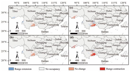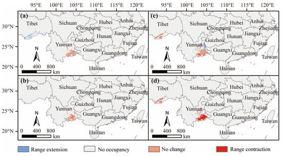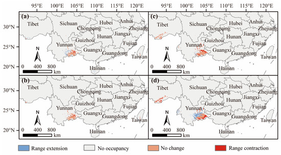 The dynamic changes in the suitable distribution areas of D. dyeriana predicted by the MaxEnt and RF models under current and SSP1-2.6 scenarios. (a) current to SSP1-2.6 2050 by MaxEnt; (b) current to SSP1-2.6 2090 by MaxEnt; (c) current to SSP1-2.6 2050 by RF; (d) current to SSP1-2.6 2090 by RF.