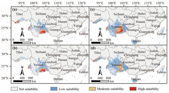 Under the SSP5-8.5 scenario, the total suitable area predicted by both models showed an increasing trend in the future (Figure 9). In the MaxEnt model, the distribution of low- suitability areas will increase. By 2050, it is projected that habitats with low suitability will be cut across seven provinces, including Guizhou, Yunnan, Sichuan, Tibet, Guangxi, Taiwan, and Hainan. The highly suitable habitats and total suitable area increased significantly compared to the current period, reaching 2.84 × 104 km2 and 20.26 × 104 km2, respectively (Table 3). By 2090, the total suitable area is expected to decrease compared to 2050. In the RF model, by 2050, the highly suitable areas for D. dyeriana were mostly scattered in the Wenshan, Honghe, and Qujing regions of Yunnan Province and were surrounded by moderately suitable areas. By 2090, similar to 2090 under the SSP3-7.0 scenario, the highly suitable area is largely projected to disappear, reducing to 1.50 × 104 km2 (Table 3). Habitat with low suitability in central Yunnan and southern Sichuan are expected to increase.