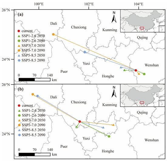 Under the SSP1-2.6 scenario, the centroid of the high suitability areas of D. dyeriana would move from Chuxiong to the national nature reserves of Wenshan and Honghe. The migration distance was relatively short. However, under the SSP3-7.0 and SSP5-8.5 scenarios, both models predicted that the centroid of D. dyeriana would move to Dali in the distant northwest region. Similarly, a study on the potential geographic distribution of 100 plant species in the Northern Hemisphere reported that the centers of distribution of these plants would generally shift northward in response to future climate change [62]. In addition, Chen et al. [63] reported that the fitness area of Saposhnikovia divaricata (Turcz.) Schischk will migrate toward higher latitudes in the future. These results aligned with the established understanding that species distributions shift toward higher latitudes or altitudes as climate warms [64].
