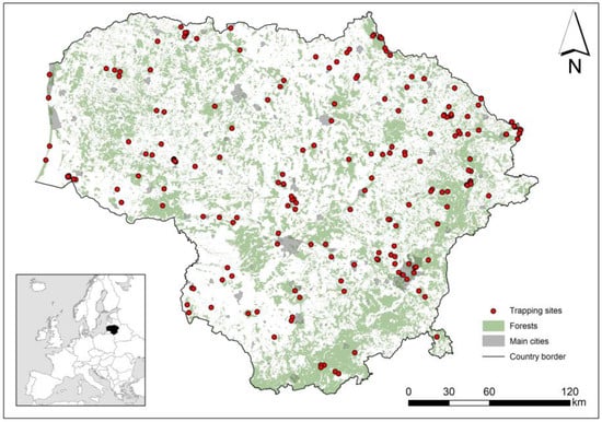 Small mammals were studied in Lithuania from 1975 to 2023, with 177 trapping sites distributed throughout the country (Figure 1). Equal trapping effort across sites and habitats could not be ensured in the long term [41,42]: the number of trapping sessions ranged from 1 to 88 per site, 1822 in total. Most of the trapping data were collected from published sources (see [41]). The database was supplemented with unpublished data from small mammal monitoring and 2022–2023 trapping data. The trapping sites were georeferenced, except in a few cases where data were related to multiple trapping sites, and sampling by site was not possible.