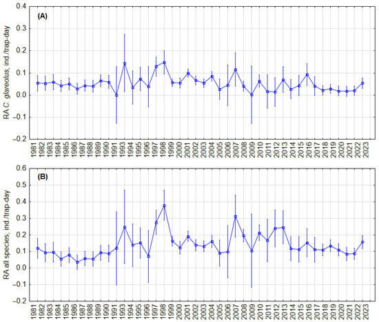 Dynamics of the annual relative abundance of C. glareolus (A) and total relative abundance of all small mammal species (B) in autumn in forest habitat. Vertical bars denote 95% CIs.