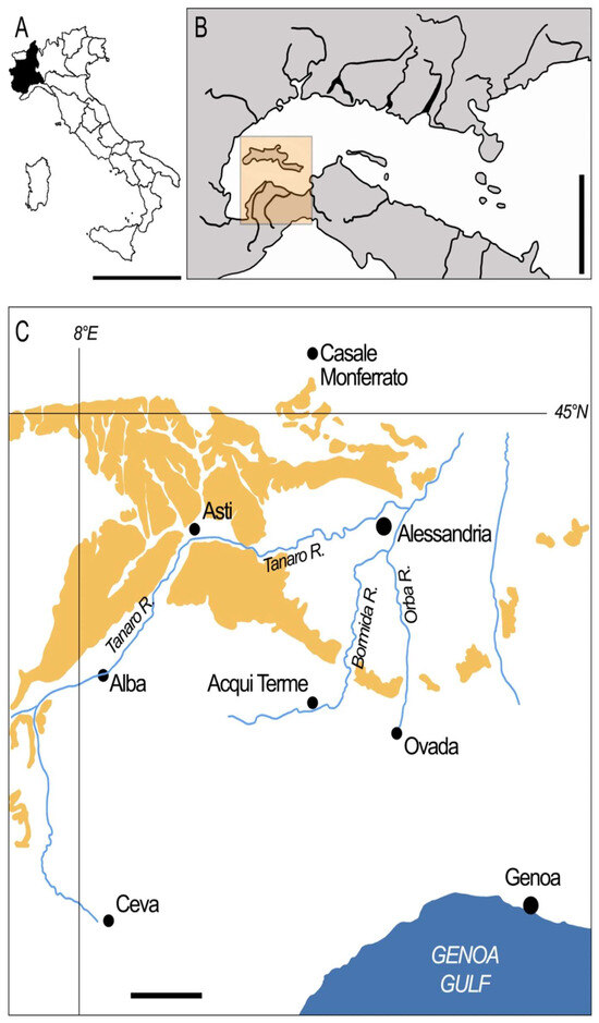 Area of the discovery of the holotype of Glaucabalaena inopinata gen. et sp. nov. (MGPT-PU 19512). (A) Italian peninsula with Piedmont indicated in black; scale bar equals 500 km. (B) Paleogeographic reconstruction of northern Italy showing the broad area of the Sabbie d’Asti Formation outcrops in the orange square; scale bar equals 100 km. (C) Map of the outcrops of the Sabbie d’Asti Formation enlarged from the orange square in (B); scale bar equals 10 km.