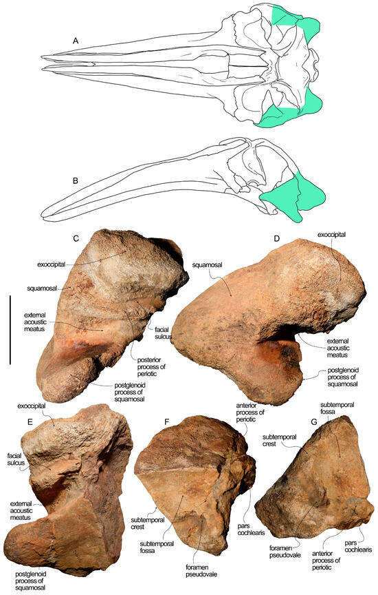 Eschrichtius robustus and Glaucobalaena inopinata, holotype. Skull fragments. (A) Skull of an extant gray whale Eschrichtius robustus in dorsal view, with indication of the preserved portions of the holotype of Glaucabalaena inopinata. (B) The same in lateral view. Glaucabalaena inopinata holotype: right fragment in (C) posterior, (D) lateral, and (E) posteroventral views. Glaucabalaena inopinata holotype: left fragment in (F) ventrolateral and (G) lateral views. Scale bar equals 5 cm.