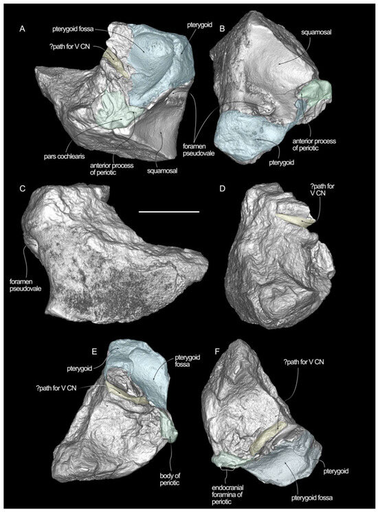 Glaucabalaena inopinata holotype. Tridimensional rendering of the left skull fragment in (A) ventral, (B) Ventrolateral, (C) dorsal, (D) medial, (E) ventromedial, and (F) lateroventral views. Scale bar equals 5 cm. Colors indicate different cranial structures.