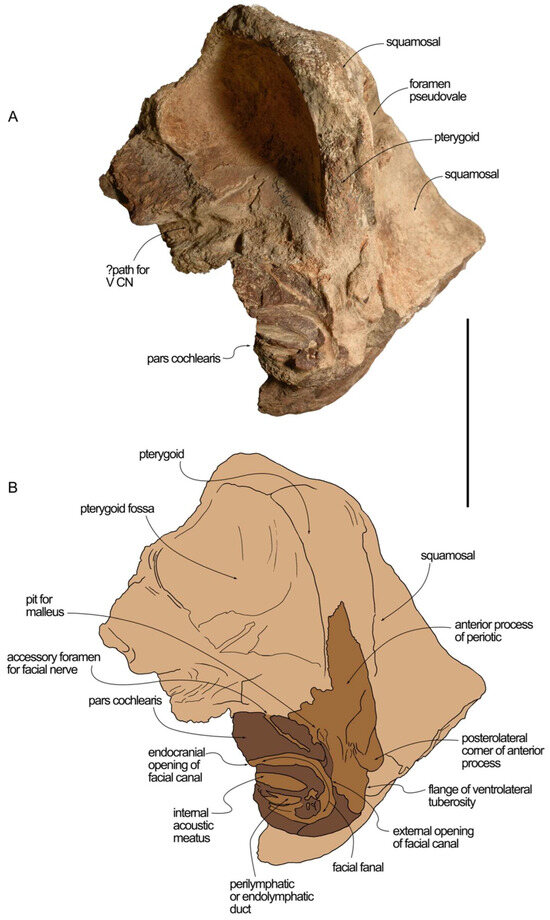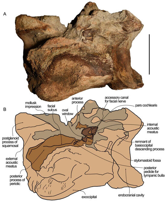 Glaucabalaena inopinata holotype. Right skull fragment in ventral view showing the periotic and associated structures. (A) Photographic representation. (B) Anatomical interpretation. Scale bar equals 5 cm.