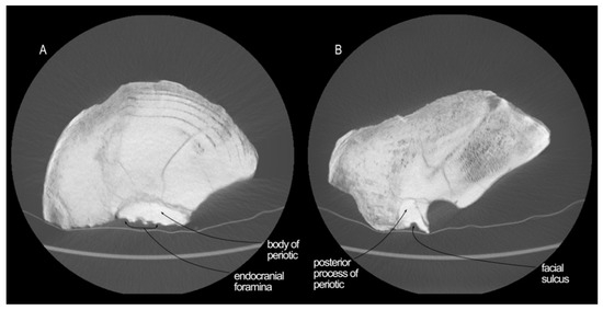 Glaucabalaena inopinata holotype. CT scan generated slices showing periotic structures. (A) Body of the periotic. (B) Posterior process with the deep facial sulcus. Not to scale.