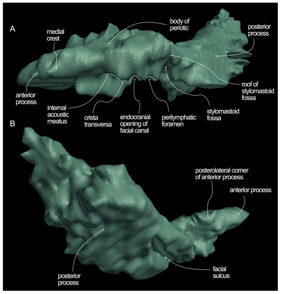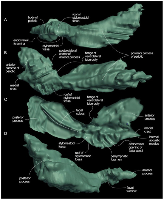 The resulting tridimensional rendering of the right periotic is shown in Figure 7 and Figure 8. From the rendering, it is evident that the suprameatal area is low and there is no superior process in this periotic; moreover, the flange of the ventrolateral tuberosity is dorsally flat and its surface is continuous with the dorsal surface of the body of the periotic. The posterior process is prismatic, with three main ridges: a dorsal ridge separating the anterior and the posterior faces, an anteroventral ridge separating the anterior and the ventral face, and a posteroventral ridge between posterior and ventral faces. The ventral face corresponds to the facial sulcus that is anteroposteriorly constrained between the anterior and posterior faces. A well-developed ventral crest corresponding to the anterior wall of the pars cochlearis is observed, which forms the anterior border of the endocranial opening of the facial canal whose dorsal outline is preserved. The internal acoustic meatus is represented by the dorsal border and appears smaller than the internal opening of the facial canal.