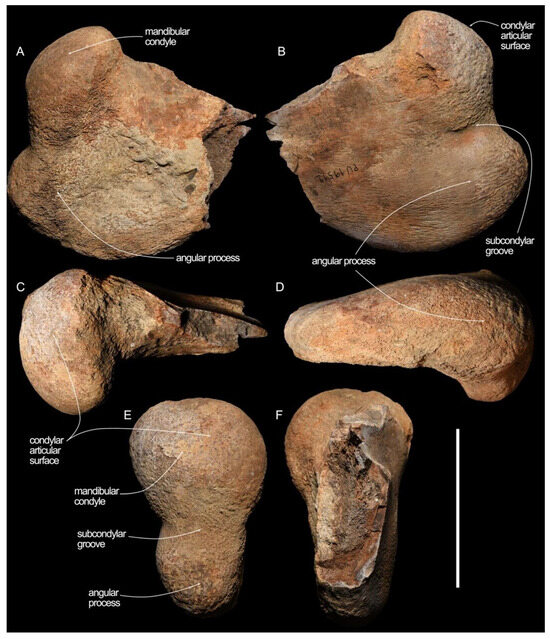When the mandibular ramus is oriented horizontally, as in the conventional view described by Bisconti et al. [4], the articular surface of the condyle is located on the top of an approximately cylindrical rising, protruding posterodorsally and connecting the articular surface to the body of the mandibular ramus. In the lateral view, the articular surface is flat-to-slightly dorsally convex. In the posterior view, the condyle shows a round outline protruding laterally and medially from the mandibular body.
