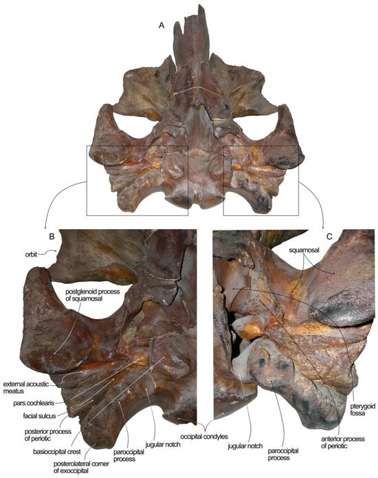 In the posterior view, the posterior process of the periotic is visible on both sides, showing a good degree of preservation and allowing observation of the facial sulcus. Slightly ventrally, a large external acoustic meatus is observed, which shows a concave bony surface projecting medially and slightly anteriorly from the lateral surface of the cranial fragments.
