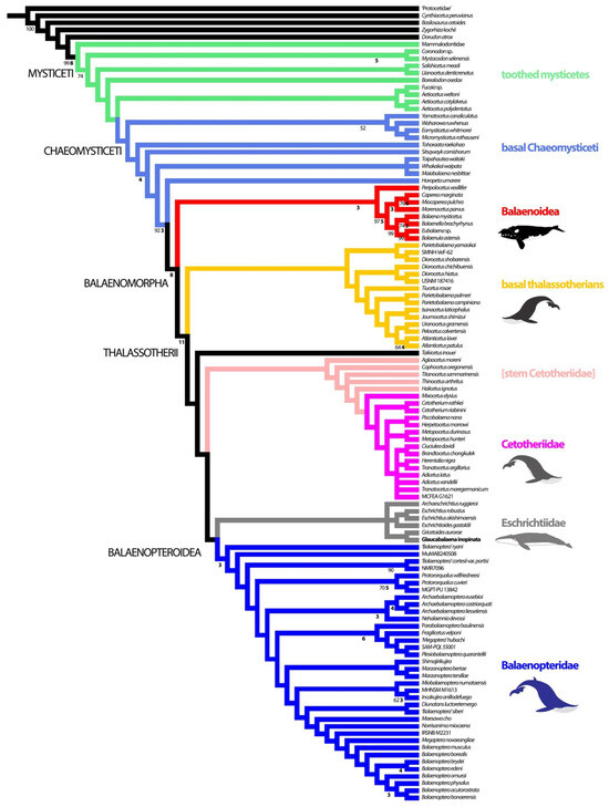 In the strict consensus of Figure 11, some discrepancies are present with respect to the result published in ref. [18], especially regarding the intra-family relationships of Balaenopteridae and, in particular, with respect to the relative position of Plesiobalaenoptera quarantellii, ‘Balaenoptera’ bertae, and ‘Megaptera’ hubachi. It is likely that these discrepancies are due to the addition of Glaucabalaena, Gricetoides, and a number of toothed mysticetes that implied new assessments of character transformations by the software. In particular, the incompleteness of many of the newly added taxa may provide the software with additional problems, implying changes in the results. The bootstrap supporting values show high support for mysticete clades like Mysticeti, Eomysticetidae, Balaenoidea, and some balaenopterid clades, and low support for a high number of other clades. This problem is well known and is attributed to the high level of homoplasy present in the dataset. The Bremer support values are moderately high for a small number of clades, including Mysticeti, Balaenomorpha and Thalassotherii. Most of the other clades have Bremer support values lower than 3 and only a few have values included between 3 and 5. Following from the bootstrap and Bremer results, we conclude that the dataset used here is particularly sensitive to minimal morphological transformations and may be prone to generate different results based on the inclusion of new taxa characterized by new character combinations. This suggests that multiple events of homoplasious transformations occurred within the Mysticeti lineage.
