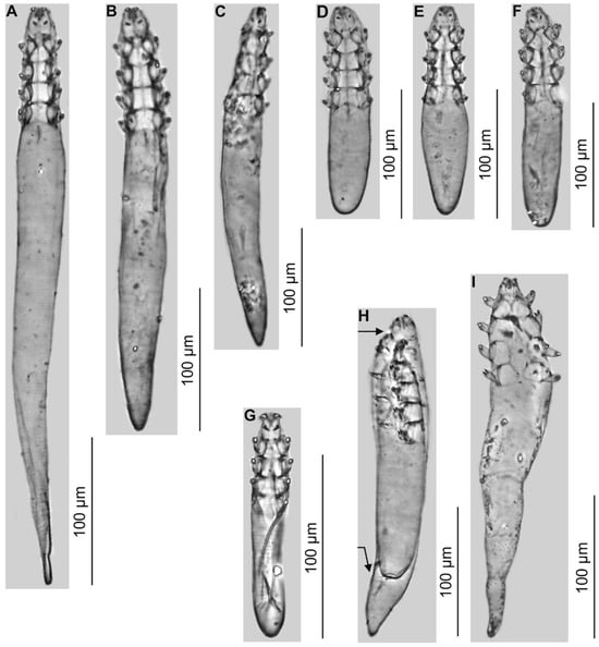 Demodecidae from Apodemus flavicollis. Demodex tenuis sp. nov.: female, various morphotypes (A,B); male (C); Demodex mediocris sp. nov.: female (D); males, various morphotypes (E,F); Demodex corniculatus: male (G); adult Demodex mediocris sp. nov. with visible remains of nymphal exuviae, arrow (H); Demodex mollis: male (I).