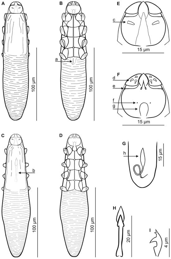 Demodex mediocris sp. nov.: female, dorsal view (A); female, ventral view (B); male, dorsal view (C); male, ventral view (D); gnathosoma, male, dorsal view (E); gnathosoma, male, ventral view (F); posterior part of opisthosoma with visible opisthosomal organ, male (G); aedeagus (H); claw on the leg (I). Abbreviations: a—vulva, b—aedeagus, c—supracoxal spine (seta elc.p), d—spines on palps, e—setae v”F, f—subgnathosomal seta (seta n), g—pharyngeal bulb, h—opisthosomal organ.