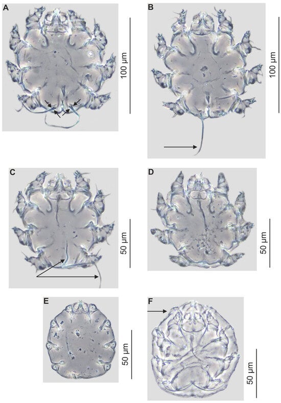 Psorergates muricola: female with four terminal setae visible, arrows (A); female with one terminal seta, arrow (B); male with two terminal setae visible, arrows (C); male without terminal setae (D); nymph (E); adult with visible remains of nymphal exuviae, arrow (F).