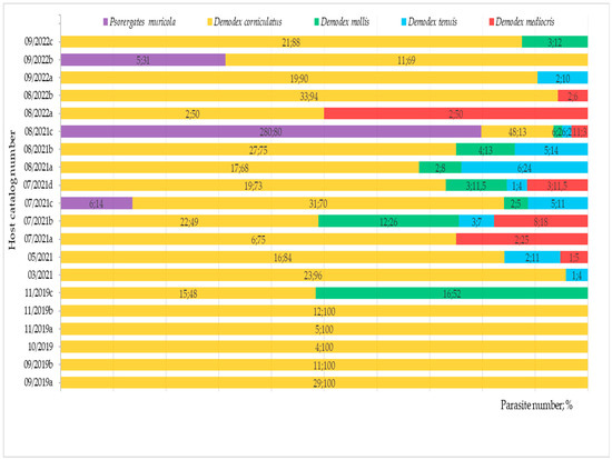 The dominant parasite was D. corniculatus, found in all mice, in various locations of the hairy skin of the body (a total of 371 specimens). However, the highest density was found for P. muricola—291 individuals were found only in the genital–anal areas in three mice. The level of infection with this mite was varied—in 1 mouse 280 specimens were found, and in the other 2 mice only 6 and 5 mites were found. No skin lesions were observed in the mice.