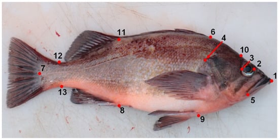 Specimens were photographed within a few minutes after capture to ensure that photos reflected fresh, relaxed, and natural shape variation. For each individual in all samples, we photographed the right lateral view for shape analysis, and we digitized 13 landmarks (Figure 2) using tpsDig Version 2.32 []. Landmarks were as follows: (1) anterior tip of the lower jaw (i.e., symphyseal knob); (2) anterior extent of the eye; (3) posterior extent of the eye; (4) posterior extent of the operculum; (5) posterior, ventral extent of the maxilla; (6) anterior insertion of the dorsal fin on body outline; (7) posterior extent of scalation at the midline on the caudal peduncle; (8) anterior insertion of anal fin; (9) anterior insertion of pelvic fin; (10) dorsal outline vertical of landmark 3; (11) dorsal outline halfway between landmark 6 and 7; (12) dorsal outline at smallest width of caudal peduncle; (13) ventral outline at smallest width of caudal peduncle. Landmarks 2, 3, 11, 12, and 13 were sliding semilandmarks. All specimens were landmarked by one researcher without respect to predictor variables. The landmarked images were then independently inspected by another researcher to confirm homologous and consistent placement of landmarks. This procedure resulted in reduced errors in digitizing []. We used tpsRelW Version 1.74 [] to align specimens via a generalized Procrustes analysis (a superimposition method to remove non-shape variation via rotation, translation, and scaling) []. We generated shape variables as partial warps and uniform components comprising the weight matrix (i.e., W). The weight matrix is used as input for principal component analysis, and the resulting principal components, termed relative warps [], are used as shape variables for the subsequent analysis. Like all principal components, relative warps are ordered by the amount of variation they individually explain. Typically, we used all relative warps that account for >1% of the variation. In this study, we used the first 10 relative warps (that collectively explain 97.1% of shape variation) to characterize shape.