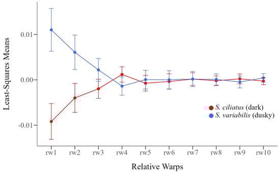 A multivariate linear mixed model assumes a univariate response variable, so we vectorized the shape variables such that each row represented one response variable, but each specimen was represented by multiple rows of data []. Thus, the first row represented relative warp 1 for the first specimen, the second row represented relative warp 2 for the first specimen, and so forth until all relative warps were represented in successive rows for the first individual. The same pattern was repeated for all individuals, each with 10 rows. The index variable preserved the order of the relative warps such that comparisons between groups (e.g., S. ciliatus and S. variabilis) were made by matching each relative warp to the same relative warp in each group (e.g., relative warp 1 in one species was compared to relative warp 1 in the other species). Our main goal was to determine how shape differed between species and if shape was different within species in different locations; thus, it was the two-way interaction of species and the index variable and the three-way interaction of species and location and index variable that tested our hypothesis of interest. Main effects by themselves (without the interaction with the index variable) tested only for an average effect across all relative warps. Because relative warps are principal components, they have a mean of 0; and, more importantly, they have an arbitrary ordination. Thus, a single individual may have a positive score on some relative warps and a negative score on other relative warps so that their mean score across all relative warps may be near 0. It was only by matching relative warps in the same order (by using the index variable as a predictor) that we could accurately test the hypothesis of interest. Specifically, the hypothesis of interest is whether shape differs between species or locations on at least some relative warps (i.e., shape variables). This vectorization of the multivariate response variables allows parametric testing of multiple and complex interaction effects and has been used successfully to test for shape variation in a variety of systems, among populations, and species [,,,,,,,,]. We estimated degrees of freedom using the Kenward and Roger method []. We used Proc MIXED in SAS to run this analysis (SAS version 9.4; SAS Institute Inc., Cary, NC, USA).