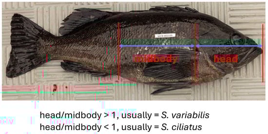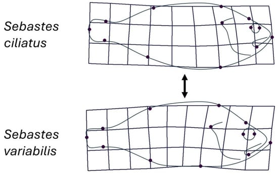 In addition to implications for the evolutionary divergence of Sebastes species, this study points out a relatively simple metric for use in the field to differentiate the two species. In general, the ratio of the length of the head (anterior extent of the symphyseal knob to the posterior extent of the operculum) to the midbody (posterior extent of the operculum to the vent) differs between the two species. If this ratio of head/midbody is >1, then the species is usually S. variabilis; however, if the ratio of head/midbody is <1, then the species is usually S. ciliatus (Figure 5). There is substantial variation in shape within each species, and the shape differences observed between species include more patterns than just this simple ratio. Thus, there will inevitably be exceptions to this general rule, but it can be a useful tool, especially if combined with differences in the coloration of fresh-caught specimens.