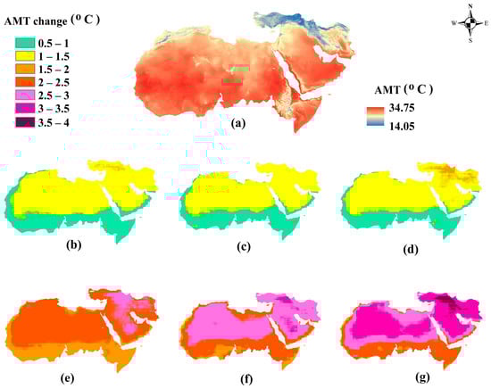 Annual mean temperature (AMT) change in the MENA region: (a) present AMT, (b) AMT change in the 2040s SSP 1.2.6; (c) AMT change in the 2040s SSP 3.7.0; (d) AMT change in the 2040s SSP5.8.5; (e) AMT change in the 2070s SSP 1.2.6; (f) AMT change in the 2070s SSP 3.7.0; (g) AMT change in the 2070s SSP 3.7.0 (Source of current and future AMT data: CHELSA v.2.1; [68]).