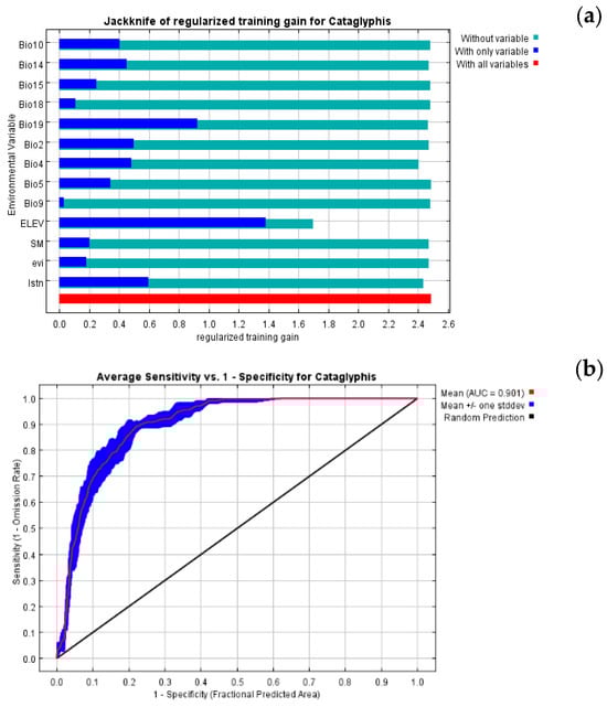 After the collinearity elimination, only 13 variables were retained for the model simulation (Table 2). According to the jackknife test results, elevation was the most significant environmental variable affecting C. nodus geographical distribution, followed by the mean monthly precipitation amount of the coldest quarter in the study area (Figure 3a). Elevation contributed 37.8%, followed by the mean monthly precipitation amount of the coldest quarter (26.8%) and temperature seasonality (17.6%) (Table 2). Previous studies revealed that workers of the Cataglyphis species dwell in hot, xeric habitats, due to their unusual capacity to survive in ground temperatures above 70 °C, which lessens their sensitivity to predators and competition from other ants and vertebrates [89]. In addition, the size of the worker, water content, water loss, and protein control play major roles in thermal resistance. As a result, larger Cataglyphis workers are better able to tolerate heat and desiccation stress, compared to smaller workers [90].