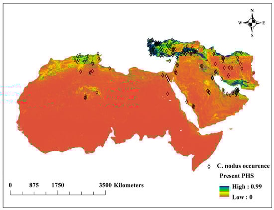 Model simulation with the present environmental conditions revealed that countries in the Northern African region, Turkey, UAE, Saudi, Oman, northern and southern parts Iran, Iraq, and Jordan have suitable potential habitat conditions for C. nodus (Figure 4). There were significant areas of extremely favorable habitat for C. nodus in the northern parts of the UAE, Turkey, and the southern part of Iran.