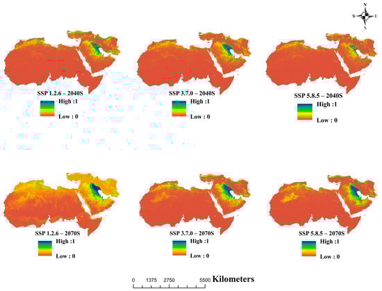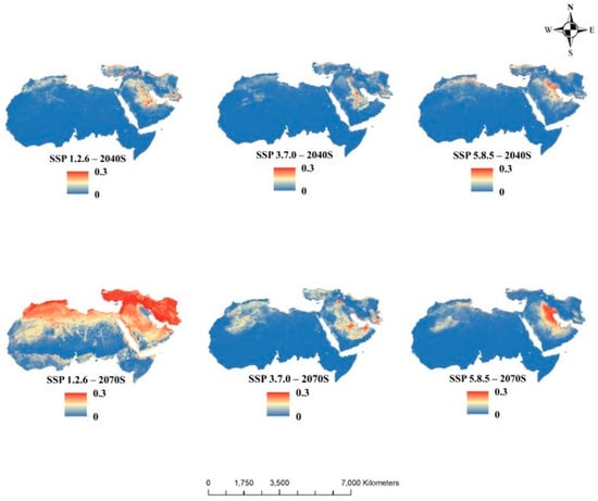 In this study, an analysis was conducted to examine the spatial standard deviation of the projected habitat suitability derived from the five climate models under three SSPs. This was achieved by utilizing the cell statistical function, which is available within the ArcGIS spatial analyst tool. The aim of the analysis was to evaluate the variation in habitat suitability predictions across the five different climate models, which can be useful for assessing the robustness of the projected results. The model uncertainty (Figure 7) was lower in the simulation for the near future (2040s). In the future (2070s), there was more uncertainty in the SSP 1.2.6 simulation for the UAE, Turkey, Iran, and the northern part of Africa, with a mean uncertainty of 0.16. This was due to differences in PHS simulation by the MPIESM12-HR model, compared to the other four models. However, the uncertainties in SSP 5.8.5 and 3.7.0 were low, with a mean uncertainty of 0.03.