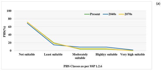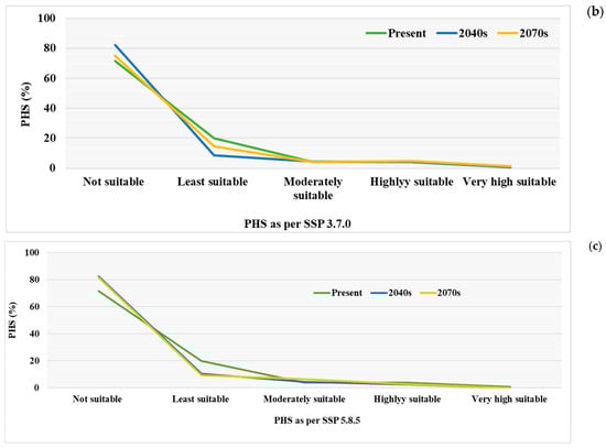 In the near future simulation (2040s), SSP 1.2.6 (Green Development Path) showed an increase in the high and very high suitable area, whereas SSP 3.7.0 (Regional Competition Path) and SSP 5.8.5 (High Development Path) revealed a slight reduction in the high suitability (Figure 6a–c). The far future (2070s) simulation showed reductions in the PHS with respect to the two SSPs, except 3.7.0 (Figure 6a–c). It may be the result of the increase in the AMT (±0.5 to 2 °C) and the associated changes in the bioclimatic conditions available for SSPs 3.7.0 and 5.8.5. Similarly, the habitat suitability modeling studies [56,94] of fire ants (Solenopsis geminate and Wasmannia auropunctata) predicted a slight decrease in the potential habitat under global warming, but favorable habitats are expected to expand to high latitudes under climate scenarios. A study by Saha et al. [95] revealed that the suitability of habitats for desert locusts will decrease in both the 2050s and the 2070s.
