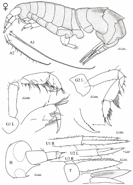 Phoxirostus longicarpus sp. nov., MBM 286818, holotype, female (6.0 mm): A1, antenna 1; A2, antenna 2; G1 L, left gnathopod 1; G2 L, left gnathopod 2; H, head, U1 R, right uropod1; U2 L, left uropod 2; U3 R, right uropod 3, and the arrow points to the ventral view of inner ramus; T, telson.