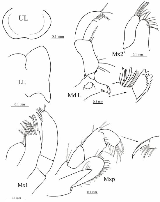 The upper lip broader than long, distal margin bilobate ventrally, bearing dense setae. Lower lip with outer lobes rounded distally with poorly developed mandibular processes; inner lobes much shorter than outer lobes. Mandible asymmetrical, left mandible incisor with fifteen unequal sized teeth, lacinia mobilis with seventeen teeth, 3 strong accessory spines; right incisor with fourteen unequal sized teeth, 3 strong accessory spines; molar well-developed, triturating; palp well-developed, 3-articulate, article 1 shortest, article 2 much broader than article 3, bearing three long setae, article 3 bearing 6 marginal and two apical robust setae, medial surface bearing dense setae. Maxilla 1 with inner plate broadly rounded, bearing two apical setae; outer plate with 5 long and 5 short spine-teeth in two rows; palp 2-articulate. Maxilla 2 with distal long setae in both plates. Maxilliped with inner plate subrectangular, hardly reaching to base of outer plate, distal margin bearing 7–8 setae; outer plate slightly overreaching distal margin of palp article 1, with 5 long terminal setae, 5 pairs of medial marginal and several lateral marginal setae; palp 4-articulate, four articles subequal in length, article 2 longer than broad, not expanded, dactylus falcate.