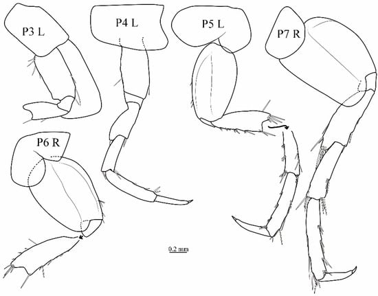 Phoxirostus longicarpus sp. nov., MBM 286818, holotype, female (6.0 mm): P3 L, left pereopod 3; P4 L, left pereopod 4; P5 L, left pereopod 5; P6 R, right pereopod 6; P7 R, right pereopod 7.