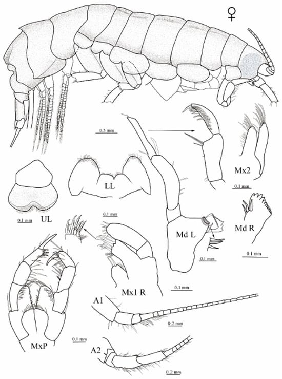 Phoxirostus yapensis sp. nov., MBM 286617, holotype, female (7.1 mm): UL, upper lip; LL, lower lip; Md L, left mandible, and the arrow points to details of two distal articles of palp; Md R, only shows the incisor and accessory spines; Mx1 R, right maxilla 1; Mx2, maxilla 2; Mxp, maxilliped; A1, antenna 1; A2, antenna 2.
