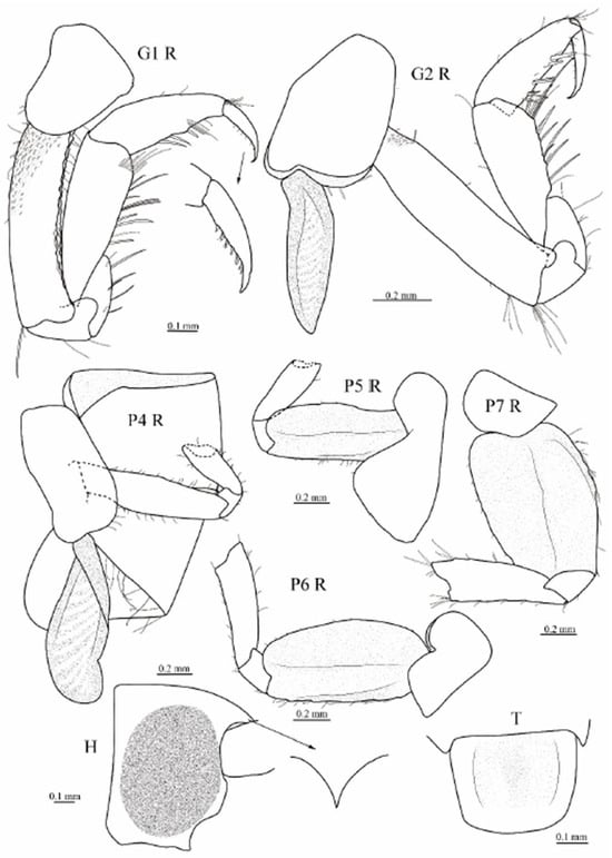 Phoxirostus yapensis sp. nov., MBM 286617, holotype, female (7.1 mm): G1 R, right gnathopod 1; G2 R, right gnathopod 2; P4 R, right pereopod 4; P5 R, right pereopod 5; P6 R, right pereopod 6; P7 R, right pereopod 7; H, head, arrow points acute rostrum; T, telson.