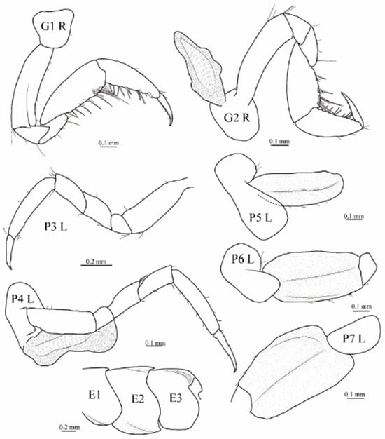 Phoxirostus yapensis sp. nov., MBM 286617, paratype, male (5.3 mm): G1 R, right gnathopod 1; G2 R, right gnathopod 2; P3 L, left pereopod 3; P4 L, left pereopod 4; P5 L, left pereopod 5; P6 L, left pereopod 6; P7 L, left pereopod 7; E1–3, epimeron plates 1–3.