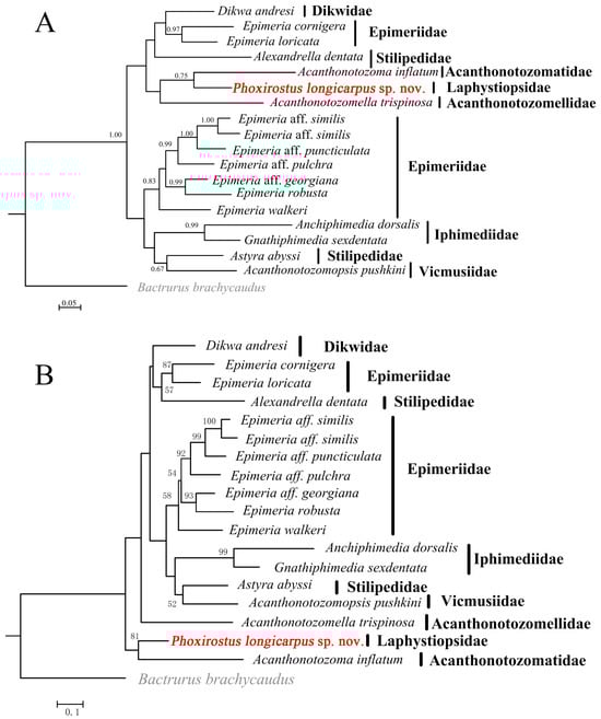 Phylogenetic tree of the superfamily Iphimedioidea Boeck, 1871, taxa resolved based on the combined dataset of four genes (COI and H3): (A) Bayesian inference (BI) tree; (B) maximum likelihood tree.