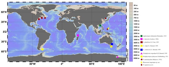 The Laphystiopsidae family currently contains eight species within three genera, which are distributed across the globe (Figure 10). Among them, five Laphystiopsis species are spread across the Atlantic, Pacific, and Indian Oceans, while two Prolaphystiopsis species are found in the Pacific and Indian Oceans [,,]. The monotypic genus Prolaphystius is exclusive to the Antarctic Ocean []. Including the present two new species, six species within three genera have been reported in the Western Pacific Ocean, and two species within two genera in the Atlantic Ocean. The Indian and Antarctic Oceans have only reported one species each. Similar to the deep-sea Ophiurus (Echinodermata) species, which has the highest diversity in the Western Pacific [], the Western Pacific also has the highest species richness of amphipod Laphystiopsidae species. This suggests that the Western Pacific may possess the highest biodiversity in the world deep sea.