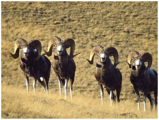 - Reading, R.; Michel, S.; Amgalanbaatar, S. Ovis ammon. IUCN Red List. Threat. Species 2020, e.T15733A22146397. Available online: https://doi.org/10.2305/IUCN.UK.2020-2.RLTS.T15733A22146397.en (accessed on 18 August 2024).
