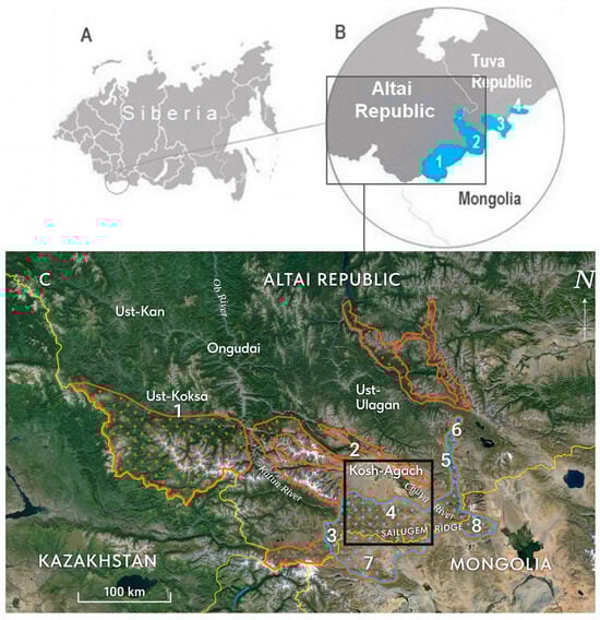 - The group in the Chikhachev Ridge, Russia (Figure 2B, 2). The habitat is located on the southern spurs of the Chulyshman Ridge (the territory of the Altai Reserve), Bogoyash River Valley, the Chikhachev Ridge (the Altai and Tuva Republics), and the Talduair Mountain group. The main habitats are the western macroslope of the Chikhachev Ridge and the Talduair Mountain group. The argali enter Mongolia and the most southern part of the Chikhachev Ridge only in especially snowy winters. The number of argali on the Chikhachev Ridge is decreasing dramatically (in 2017, there were 360 argali individuals, but in 2023 there were only 60) [24].