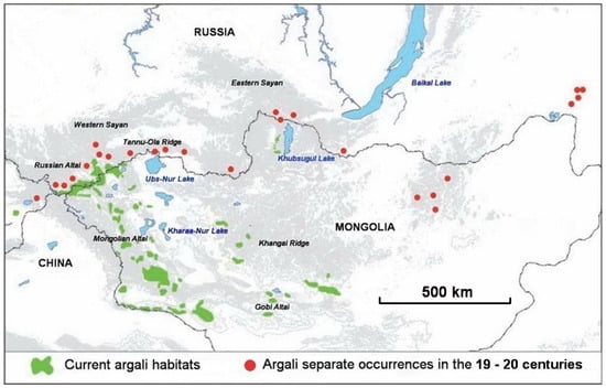 - The group in the Sailugem Ridge. The argali habitat here is located on both sides of the Sailugem Ridge in the Altai Republic (Russia) and Mongolia. The largest transboundary grouping of argali occurs here (Figure 2B, 1). In 2023, 2644 argali were recorded in Russian territory, and 2477 in Mongolian territory [24]