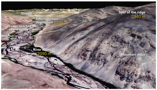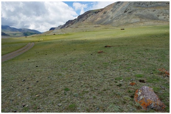 | Slopes of the lower reaches of the river valleys of the Sailugem Ridge in a belt of 2100–2300 m a.s.l. (about 4–5% of the Ridge area) | Dry steppes dominated by Poa botryoides, Artemisia frigida, and Potentilla acaulis (Figure 9c,f) | Gradual replacement of desertified steppe phytocoenoses by communities of wormwood (Artemisia santolinifolia) (Figure 9b) | Degree of productivity change is unclear, but it will reduce, with a decrease in forage quality and quantity |