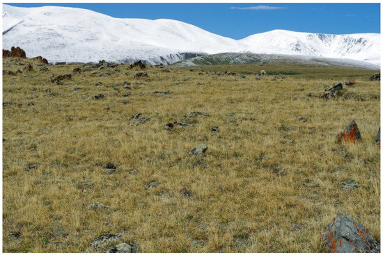 | Plateaus at altitudes up to 2300–2700 m a.s.l.) occupying most of the northern territory of the Sailugem Mountain Ridge (about 60% of the Ridge pasture area) | Steppes dominated by Poa attenuata (Figure 6), many of them with significant degradation caused by anthropogenic influence (Figure 9f) | On the southern slopes, P. attenuata steppes will be replaced by steppes with Agropyron cristatum (Figure 9d) and Koeleria cristata On rocky slopes up to 2500–2600 m a.s.l., communities of spiny cushion plants (e.g., Oxytropis tragacanthoides (Figure 9e) will spread. Slopes of other exposures up to an altitude of 2500 m a.s.l. will be occupied by cold wormwood steppes with a predominance of Artemisia frigida (Figure 9f) At about 2800–2900 m a.s.l., where steppes with Poa attenuata will occur, the co-dominants will be Saussurea schanginiana and other xeromorphic species [46] | On southern slopes, pasture productivity will decrease by 50%. Overall reduction in productivity of 35–40%. Decrease in quality and quantity |