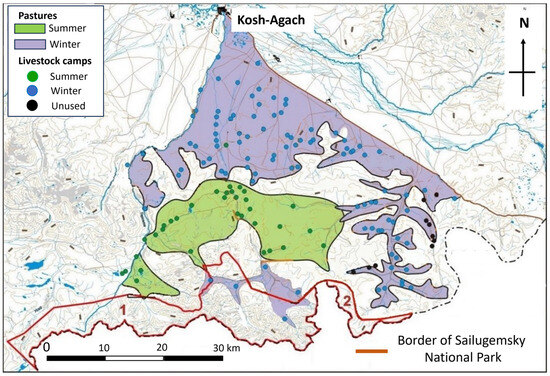 - Robertus, Y.V.; Bailagasov, L.V.; Tolbina, Z.B.; Lyubimov, R.V.; Ledyaeva, N.V.; Manysheva, T.V. Status and Ways of Optimizing the Use of Pastures in the Russian Territory of the Sailugem Ridge (Republic of Altai); Toolkit: Gorno-Altaisk, Russia, 2010. (In Russian) [Google Scholar]
