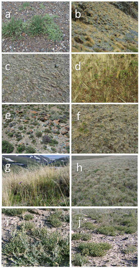 | Kosh-Agach Village vicinities in the Chuya Steppe (Figure 2C) | Fragmentary desert vegetation dominated by Krascheninnikovia ceratoides (L) and Anabasis brevifolia C.A.Mey., (Figure 9i,j) and other petrophytes and halophytes (Figure 9a) | Widespread desert vegetation dominated by Krascheninnikovia ceratoides | Reduced vegetation productivity and forage quality and quantity |