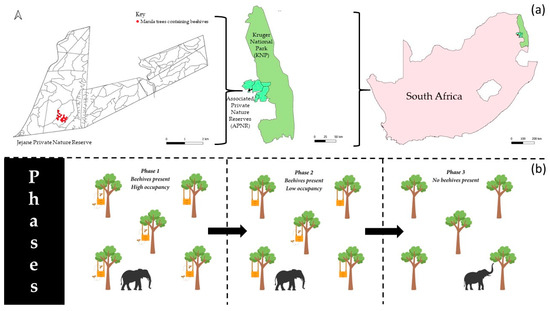 (a) Location of the Jejane Private Nature Reserve (JPNR) within the Associated Private Nature Reserves (APNR) of South Africa, and (b) a visual illustration of Phases 1–3, indicating the varying levels of beehive occupancy per phase.