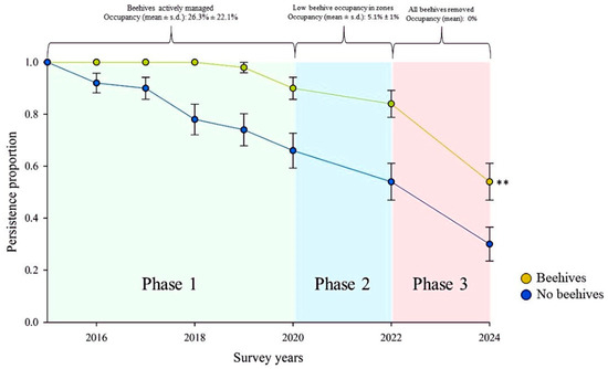 Persistence proportions of the marula trees with beehives present and absent across Phases 1–3 of the study within the Jejane Private Nature Reserve (JPNR) within the Associated Private Nature Reserves (APNR) of South Africa. ** p < 0.01.