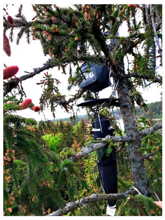 This study was conducted in eastern Lithuania, Baltic region of Europe. Insects were collected using three UV BG-Pro traps (Biogents) designed for collecting biting midges in three mature forest areas (near Dusetos 55°47′, 25°48′, in Labanoras forest 55°18′, 25°50′, and near Tauragnai 55°28′, 25°55′), which represent the coniferous dominant forest landscape of that region. All three study sites were coniferous forest stands bordering with the swamp forests, suitable for the breeding of Culicoides larvae. In each forest area three traps were installed simultaneously on different mature Norway spruce trees (Picea abies) growing at least 20 m apart from each other (to avoid interference between traps), but closer than 50 m and growing at the same habitat. We hung each trap at different heights (Table S1): at ground level (1.5 m), mid-canopy (~13 m, range 12.3–13.5 m above the ground), and high-canopy (~23 m, from 22.7 to 23.5 m). The slight variations in heights of set-up traps in mid-canopy and high-canopy were because of the necessity of finding the branches suitable to hang the trap within individual tree. The Norway spruce was chosen because trees of this species have a straight vertical trunk from the bottom to the tree top and are tall enough to reach a height of more than 25 m; therefore, traps can be hung at similar heights in different forest stands. Using rope and ascending equipment, we climbed to the trees to set up traps. The traps were turned on 3–4 h before sunset and turned off 2–3 h after sunrise the next morning (Figure 1). A mesh with a diameter of 2 mm limited the entry of insects into the trap, preventing large insects from entering. Insects were collected in a container with water supplemented with a drop of soap.