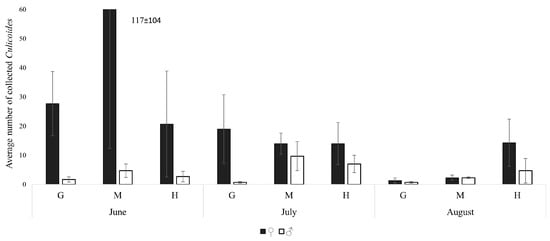 The average numbers (±SE) of Culicoides males and females collected at different heights in June, July, and August. G—ground level (~1.5 m above the ground); M—mid-canopy (~13 m above the ground); H—high-canopy (~23 m above the ground).