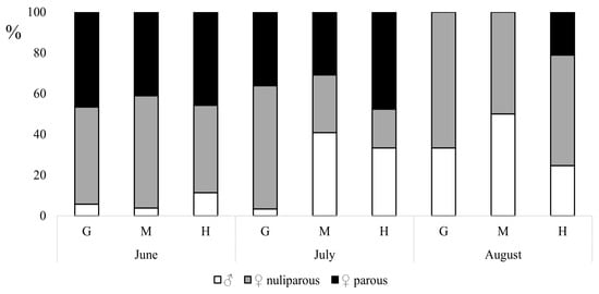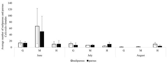 Of the total, 55.4% of the collected Culicoides females (n = 697) were nulliparous, and 44.6% were parous. The relative abundance of parous Culicoides females varied from 42.4% in the mid-canopy to 50.0% at the high-canopy collection points, and no statistically significant differences between the proportion of nulliparous and parous females were determined (p = 0.2). The proportion of parous and nulliparous females varied during the season, as in June and July, we collected 45.8% and 48.6% of parous females, respectively, and only 23.6% of females were parous in August (Figure 3 and Figure 4). Thus, statistically significant differences were detected in the proportion of parous females between August and June (p = 0.002, t = 9.9), as well as between August and July (p = 0.015, t = 10.1). However, we found no differences in female parity between June and July (p = 0.6). We did not detect freshly blood-fed females during this investigation.