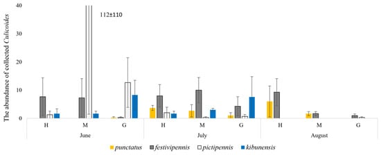 Culicoides punctatus (Mg.) (n = 46) were collected from June to August, with the highest abundance being at the high-canopy strata (63.0%), and some biting midges were caught at the mid-canopy (28.3%). Culicoides kibunensis Tokunaga (n = 65) was caught mostly in June (n = 35) and July (n = 28), with the majority (66.2%) of biting midges caught at the ground level (Figure 5).