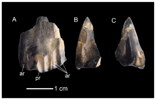 Right maxillary crown MAP-8523 of the I. galvensis specimen from the SC-4 site (Galve, Teruel, Spain). Views: labial (A), distal (B), and mesial (C). Abbreviations: ar, accessory ridges; pr, primary ridges.