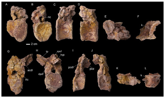Dorsal vertebrae of the I. galvensis specimen from the SC-4 site (Galve, Teruel, Spain). (A–F), MAP-8499. (G–L), MAP-8495. Views: cranial (A,G), caudal (B,H), left lateral (C,I), right lateral (D,J), dorsal (E,K), and ventral (F,L). Abbreviations: acdl, anterior centrodiapophyseal lamina; nc, neural canal; dpof, diapopostzygapophyseal fossa; hyp, hyposphene; k, keel; pcdl, posterior centrodiapophyseal lamina; poz, postzygapophysis; spof, spinopostzygapophyseal fossa; tp, transverse process.